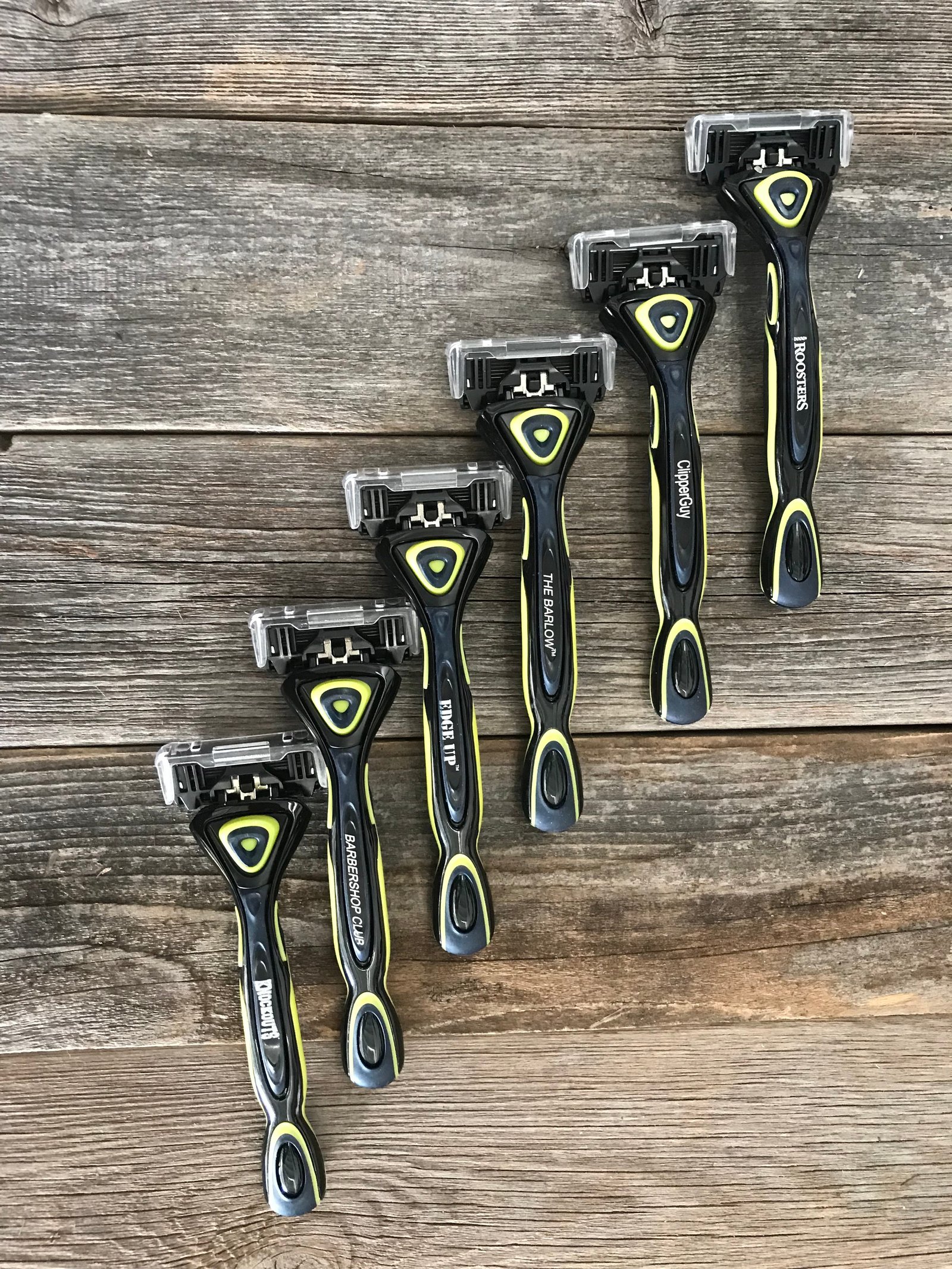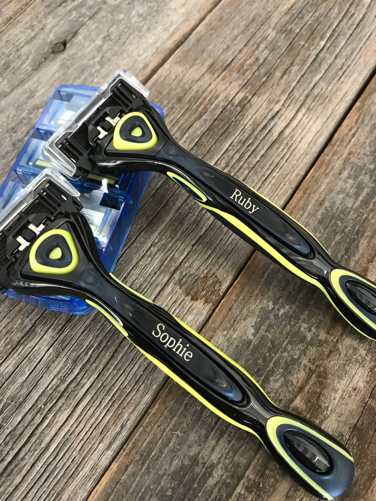 This set includes one personalized razor handle with attached blade cartridge, and 4 additional replacement cartridges.